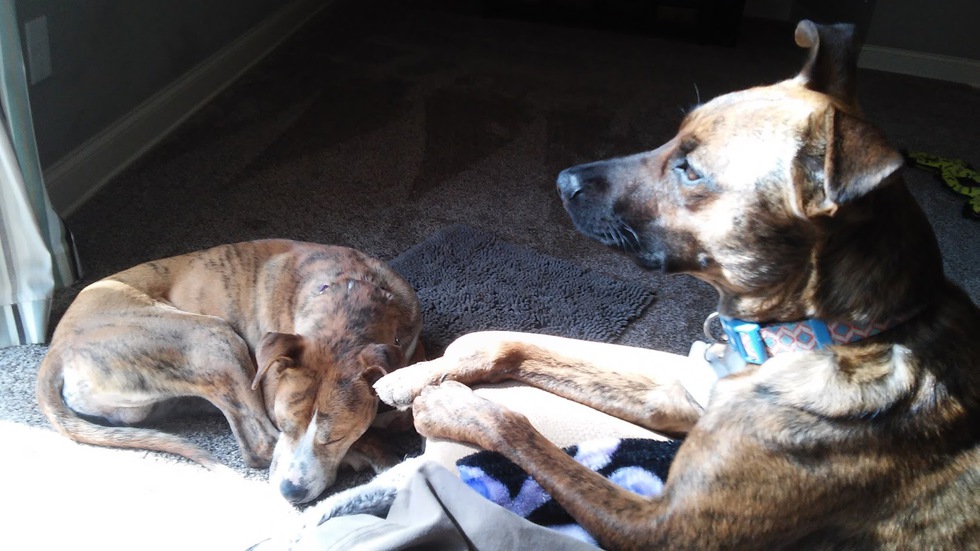Our own dog Kaya came to us scared and anxious but very playful. She's not the best people dog, but she is an amazing dog dog. Tony, laying down here, came to us as a frightened foster, afraid even of dust and shadows. Kaya took it upon herself to watch over him, play with him, entertain him, and show him that humans are kind, caring, and can be trusted. Here, she's watching out the door to the yard, ready to take on any squirrel or chipmunk that might bother Tony. In a short time Tony blossomed and got adopted, largely due to Kaya's extraordinary ability to understand dogs and get them to trust her. Kaya is of course still with us, teaching us to be kind and silly every day.