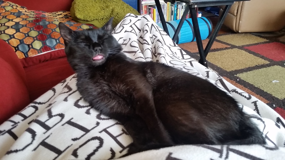 Matilda is an 8 month-old adorable weirdo. She's obsessed with running water, so she must be present whenever anyone takes a shower, and she often does a handstand on her water dispenser when she's getting a drink. When she's not zooming around, knocking over lamps and bothering her brother, she's a very nice nap companion.
