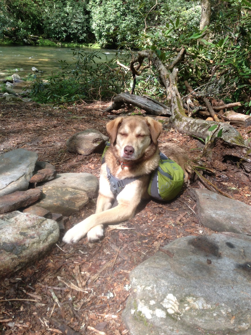 Tupelo sleeping with her pack on. She loves to hike!