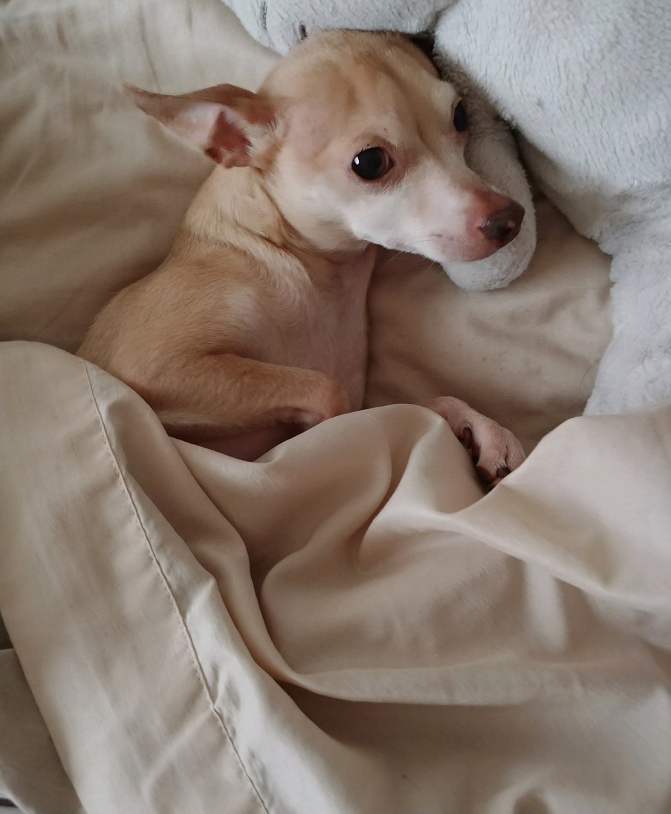 Standing at a whopping 8” tall, Bruno spends most of his days barking and guarding his family from many potential enemies such as the threatening leaf blowing in the wind. He loves long walks around the neighborhood, playing hide and seek, and eating food....lots of food..including his favorites: chicken, chicken, and some chicken. His best friend and mortal enemy is a tabby cat named Snuffy and they spend many hours chasing each other around the house.