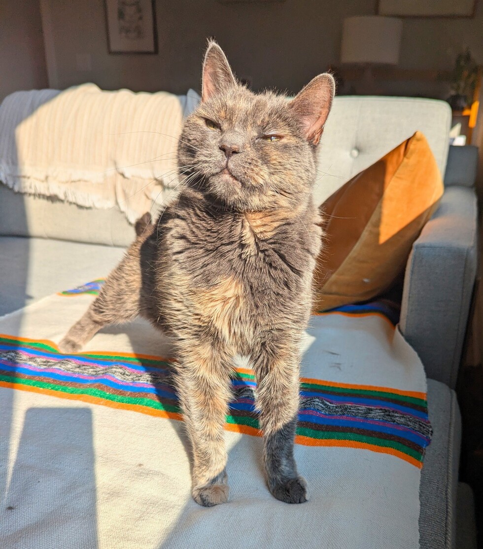 Meet Florence the cat! She is an outgoing senior rescue kitty, at 13 years young (at least!). She has mild cerebellar hypoplasia which means she walks and plays with a little wobble and has a wide stance to keep from tipping over. She is a big people-person who loves wiggling to the door to greet her humans and is excited to make new friends. When she's not busy demanding pets and attention, she spends her free time napping in the sun or bird watching from her window.