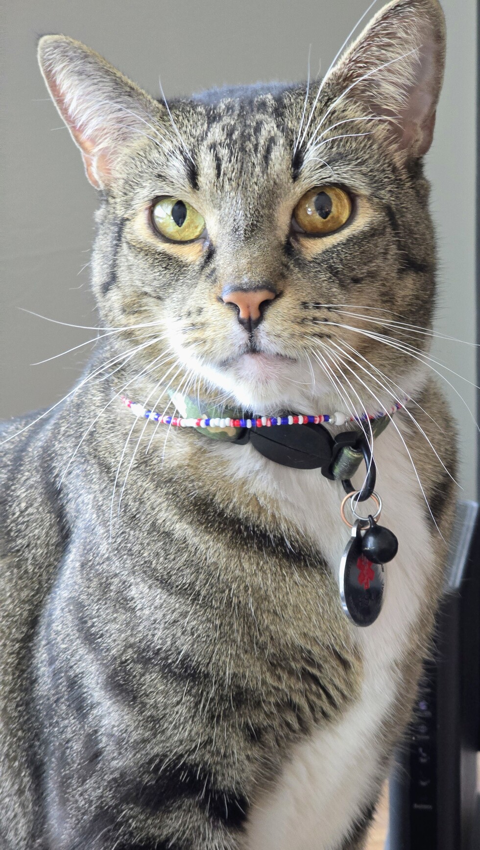 Simba is a 6 year old Tabby & part Maine Coon. He picked me on July 25, 2025. He is very playful & loves his mouse & bird feather teasers. He is the King of my condo & all 1400 square feet are his domain. His favorite spot is laying on a window sill in the den with the Sun on his body. He has the whitest paws & belly & loves to show both.