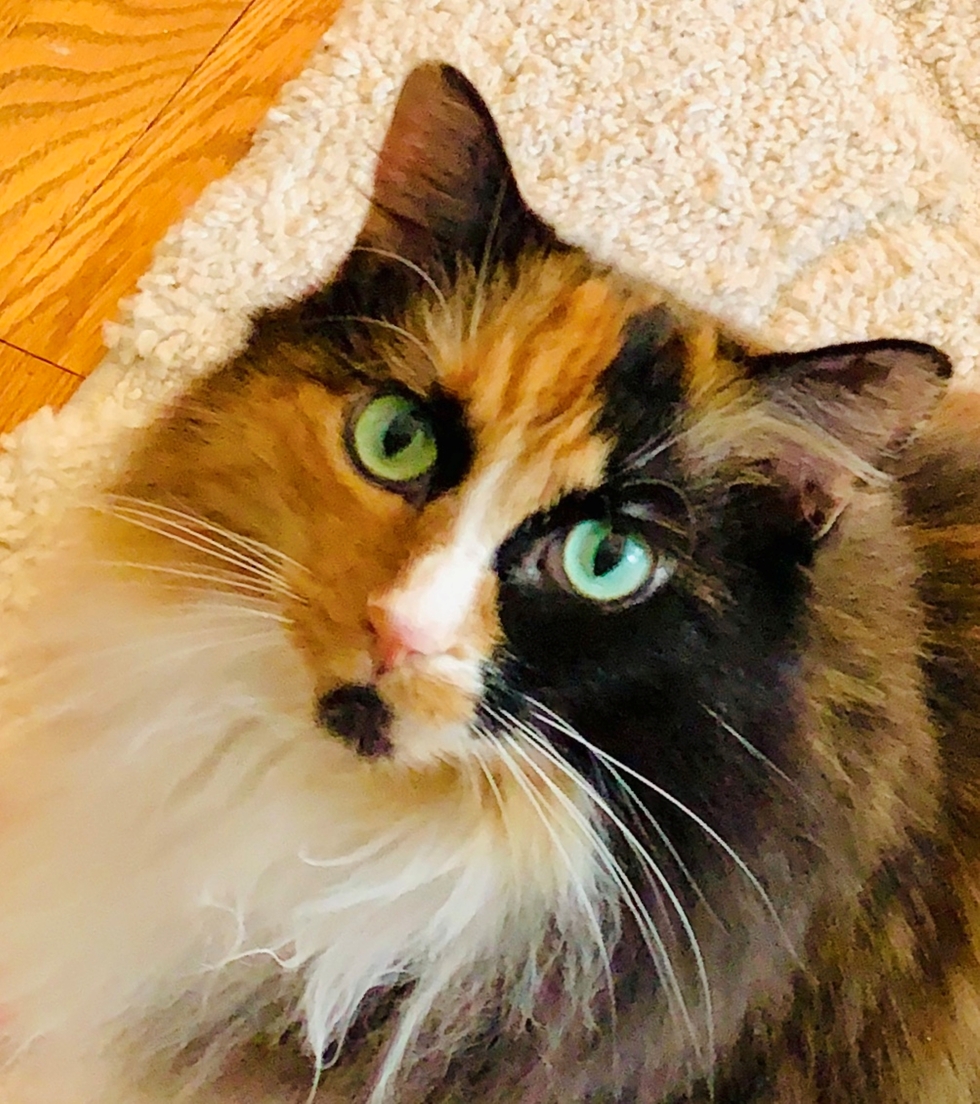 Hard to believe Callie turned 13 in April (adopted years ago from Paws for Seniors who fortunately rescued her, siblings, and mother cat when sadly their owner was found dead in their home). She's a very sweet, upbeat, and grateful girl who has a lot to say and is quite empathetic. And those eyes...as if she's peering inquisitively into your soul. She senses when her human gets stressed; her beautiful tail becomes a lightning rod to help re-ground. Now when her human sings (always on key!), she thinks something's wrong and places her paw on her arm and 'talks' to help comfort her. She loves sunning and watching birdies. The best 'laptop', she'll roll over ISO tummy rubs. She's donated her food (a major concession as she loves to eat) to AWLA for others in need. Was humbled when honored as pet of the month by Sit-A-Pet earlier this year.