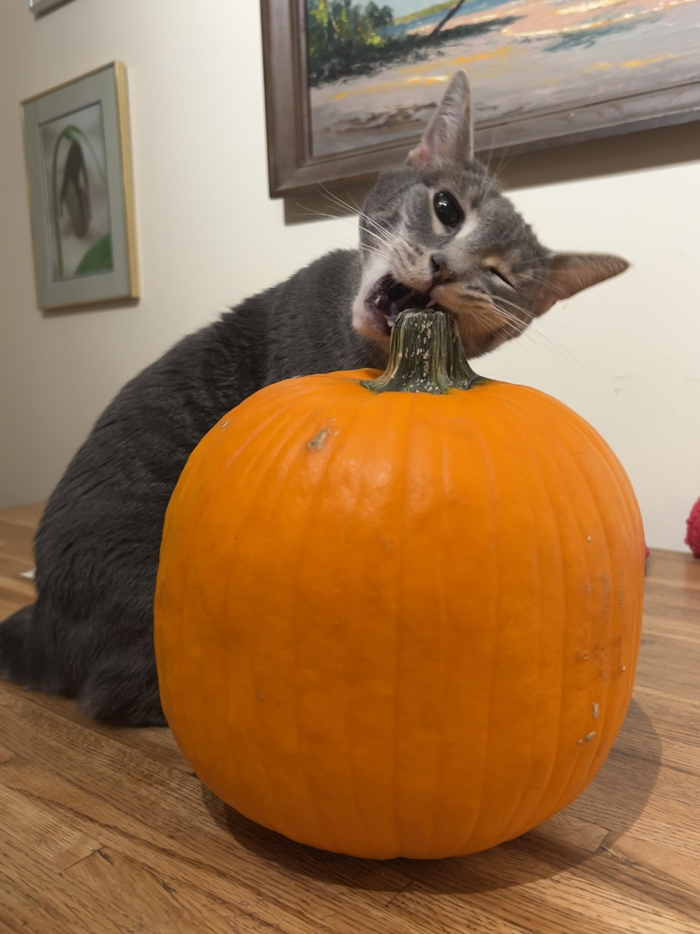 Once a timid kitten rescued from Front Royal, VA, Lily has blossomed into a curious, playful, and loving companion. With patience and care, she learned that humans (and dogs!) can be best friends. Now she adores snuggling, chasing toys, and showing new foster siblings the ropes. Lily’s gentle heart and big personality make her the star of the family — and she’s all ready for Halloween fun! 🎃💜