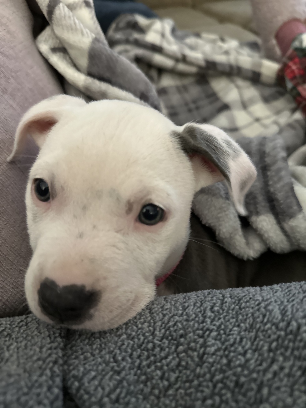 A few months after losing our 12-year old lab-mix Ryleigh to cancer, we decided to adopt a new pit bull-mix puppy to bring some life back into our family. After grieving such a huge presence in our family, we were so excited to adopt Nami, who is a bundle of snuggles and sunshine. She fit right in! She fell in love with her big sisters, Lana (12-year-old Pit Bull) and Eliza (2 year old human-baby). Lana suddenly turned back into a puppy herself and loved playing with Nami, before passing in January. Through so much loss, Nami has been our ray of sunshine. Nami’s special trick is putting a smile on anyone’s face that she comes around. She’s so gentle and snuggly, knowing when you need a warm snuggle on the couch or a sloppy puppy kiss.