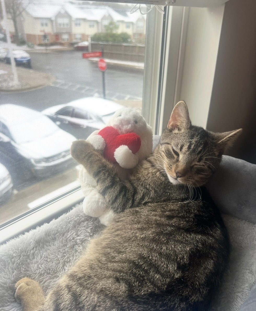George loves cuddling with Jellycats, collecting purple Pom Poms, and stealing some of mom’s coffee. He also loves watching football and going on nightly walks with his mom. He sure lives up to his name “Curious George.”