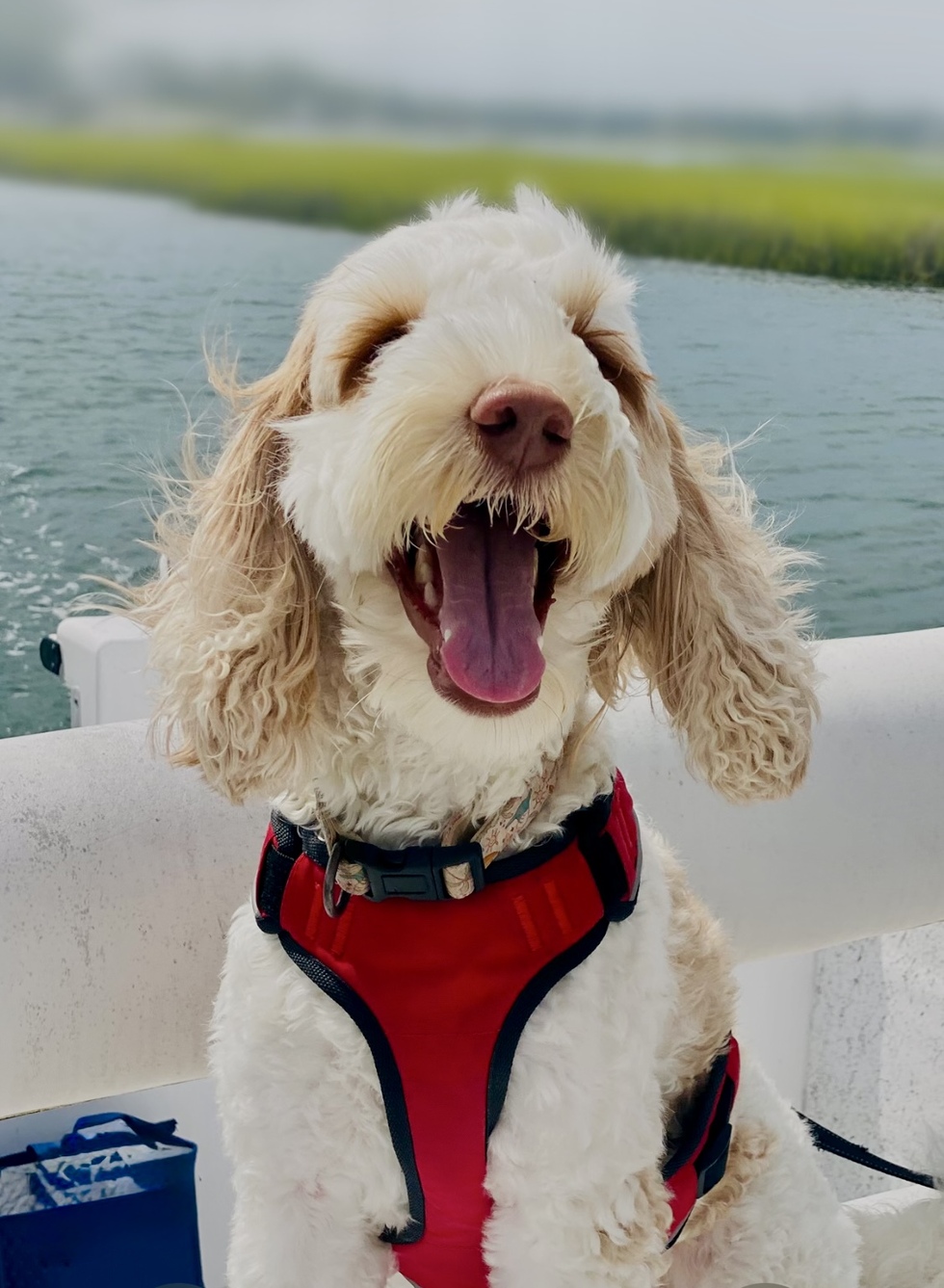 Mookie is the silliest of pups. He loves to fly through the air at the TV whenever there is a dog or other animal on TV. He also gets very excited for random events on TV such as Olympic speed skating. The commercials are so exciting! TV is his favorite !! Mooy smiles all the time with his tongue out! He’s just a gorgeous doodle with his white and tan markings and fluffy white tail! Moo is gentle and loving, a true therapy pup. We are so lucky to be his family. He loves so big!! People always want to stop and meet him!
