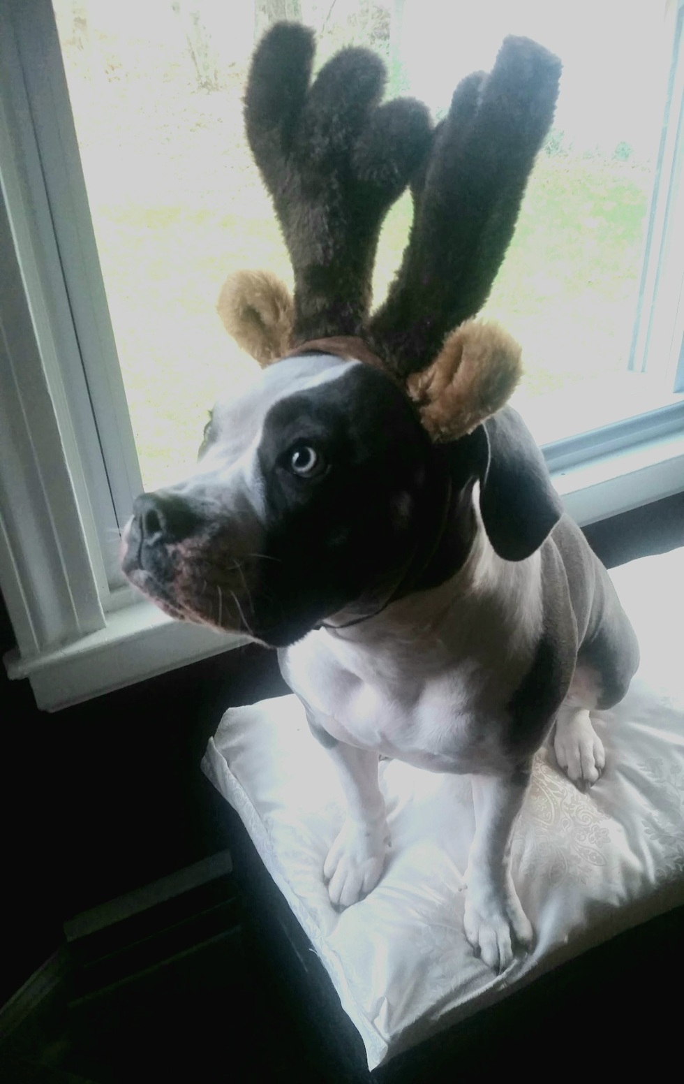 Blueberry the Blue Nose Pit-Deer! Bonnie Blue was rescued at 3 months. She was backyard bred for fighting but was the runt and therefore was put up for bait. She's had her ups and downs in life but there isn't a human she's met that she hasn't loved! She's a patient playful pup and a very big mommy's girl.