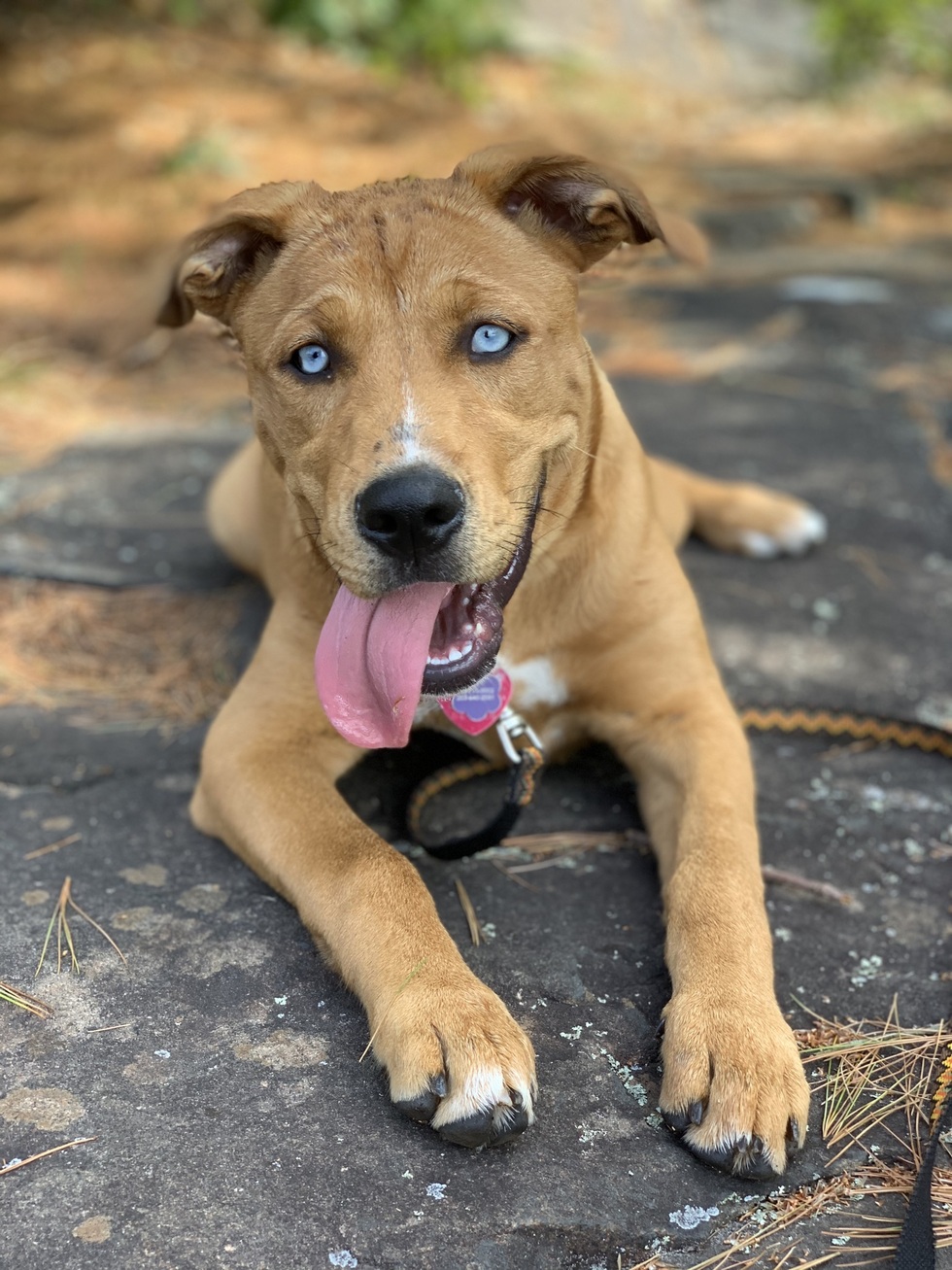 Eva was born from a catahoula mix litter in GA, the owners couldn’t afford to feed her so she went to a shelter and a foster at just 12 weeks. We saw her “mugshot” on the adoption site and just knew we needed to give her a fur-ever home. A year later she is the Queen of her home with her 3 kitty sisters, enjoying hikes in the mountains and playing with her 10000 tennis balls!