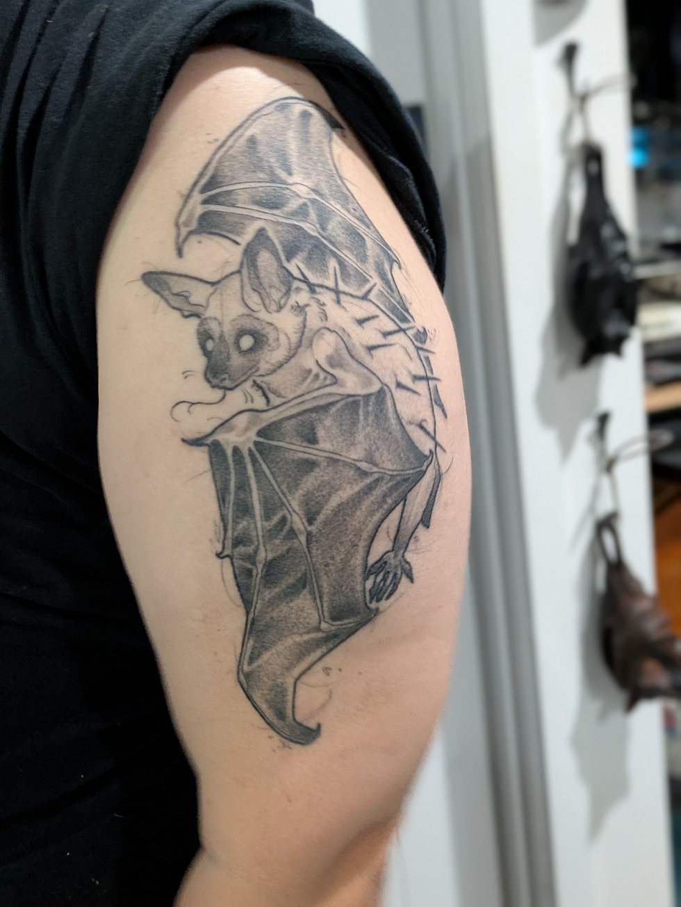 The tattoo was done by Emma Mckie of Absolution, Christchurch. New Zealand/Aotearoa has two native bat (pekapeka) species: the long-tailed bat (Pekapeka tou-roa, Chalinolobus tuberculatus) and the lesser short-tailed bat (Pekapeka tou-poto, Mystacina tuberculata).