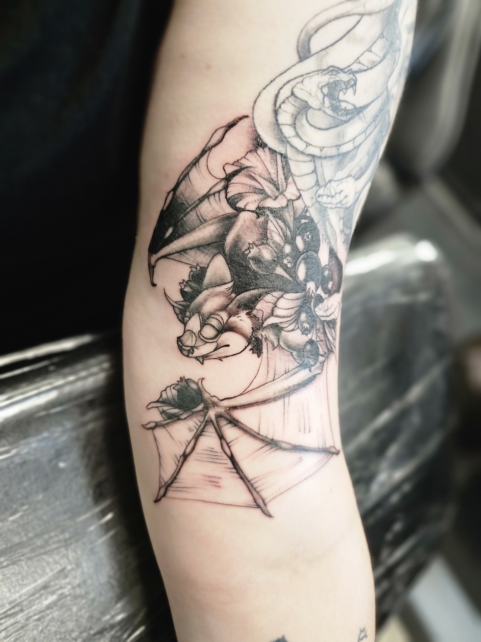 This piece means a lot to me. It’s more than just a bat—it's a symbol of resilience, duality, and finding beauty in the shadows. I put a lot of thought and care into the details, blending delicate black and grey shading with whip texture to give it life and motion without overwhelming the softness I wanted to preserve in the wings and face.