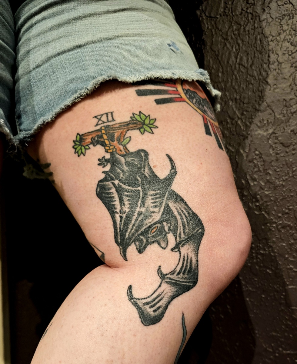 I love bats and other flying critters. This bat is done like The Hanged Man tarot card.