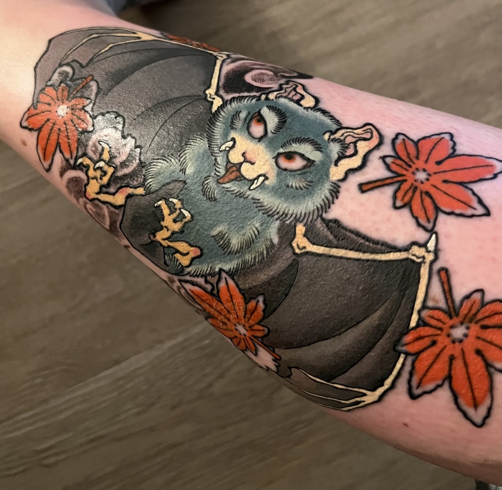 My bat tattoo, done by AJ Basilio in Los Angeles, merges my love for Japanese art with my love for bats. It was also a cover-up of another tattoo, so in a way it represents a new era in my life.