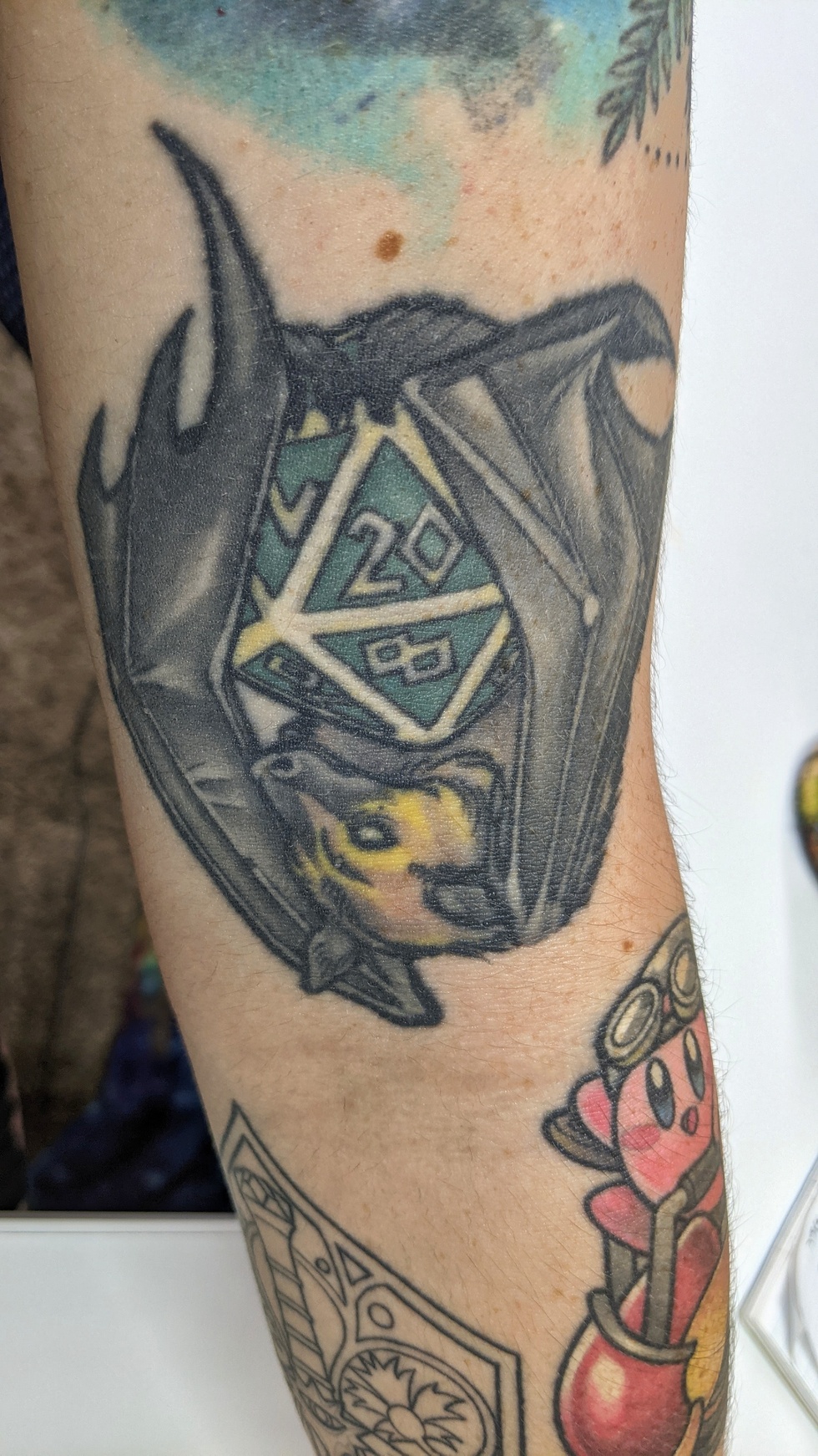 This tattoo design was chosen to display both my love of bats and the game Dungeons and Dragons, two very important things to me.