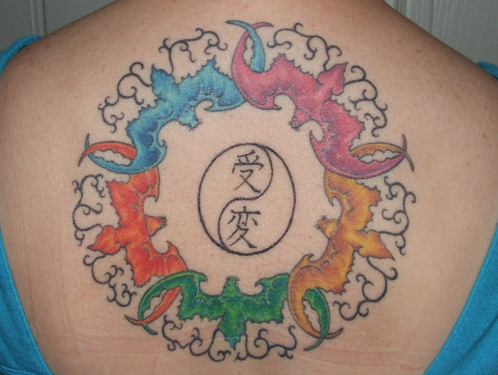 The Wufu is a Chinese symbol of five bats in a circle. The bats represent the blessings of Health, Wealth, Long Life, Virtue, and a Peaceful Death. The yin yang in the center contains the kanji for acceptance and change, representing the dialectical saying by Carl Rogers, “The curious paradox is that when I accept myself just as I am, then I can change.”
