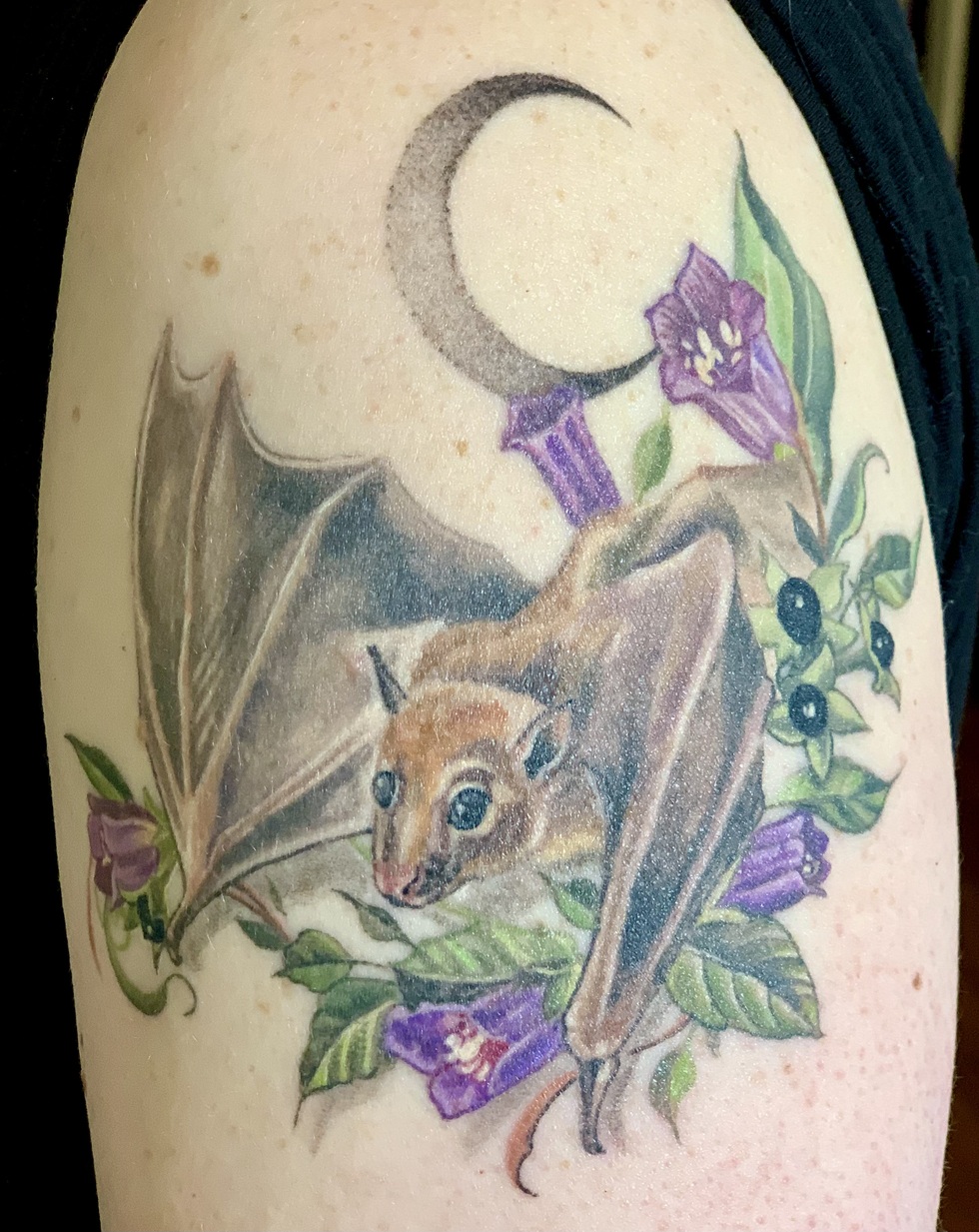 I absolutely love bats and all things considered creepy or misunderstood. I fell in love with Egyptian Fruit Bats when I first saw Peek-A-Boo and what a personality he had, and I used him for some of my reference photos for the tattoo. This is showing my love of bats and Deadly Nightshade, which I think is a beautiful plant. Bats are so important, and I wanted one with me at all times!