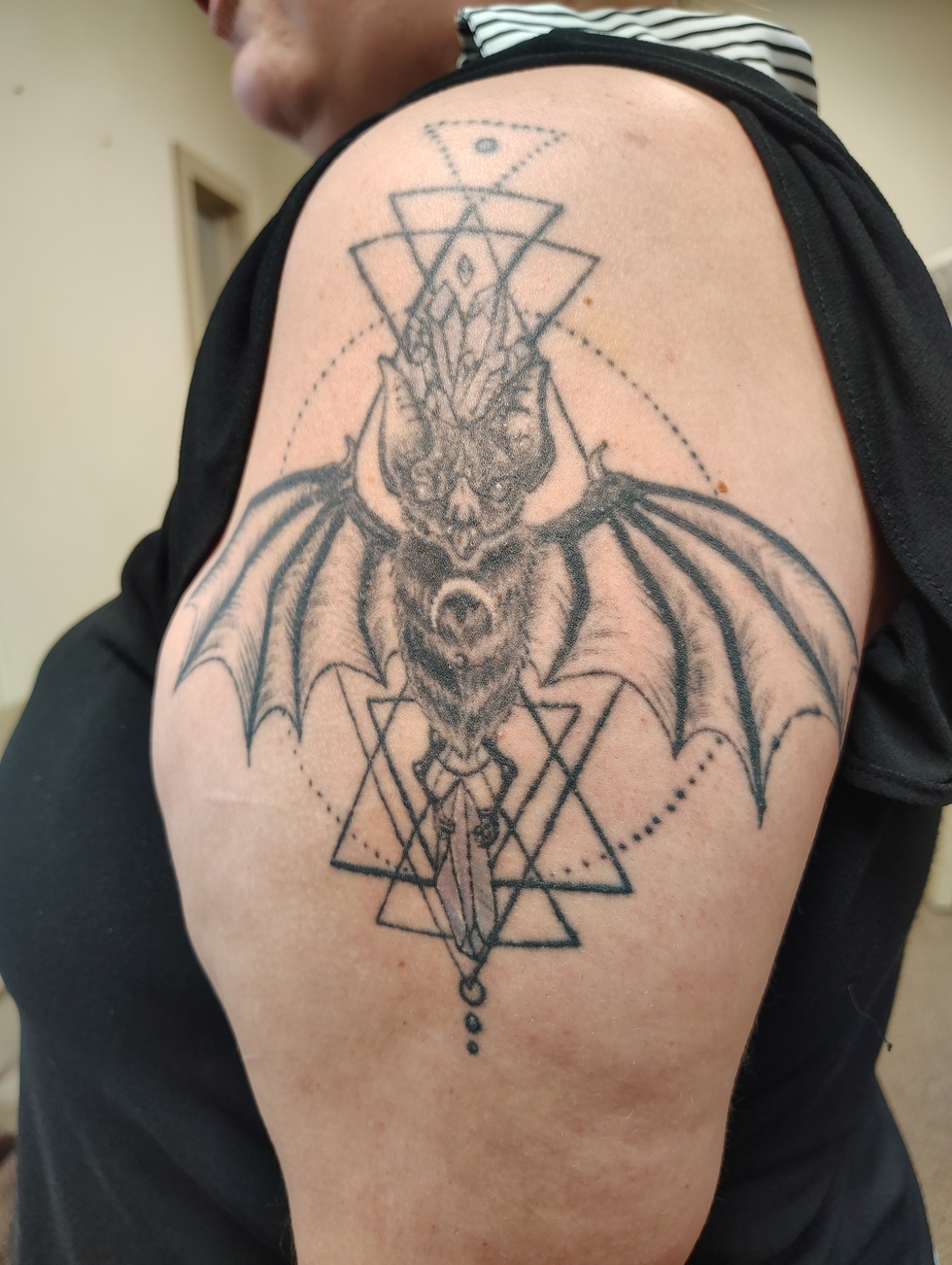 I was working at a shelter as an attendant and helped with saving a bat that was trapped indoors, and decided to draw this while passing time, then got it tattooed that night! 🦇🦇🦇