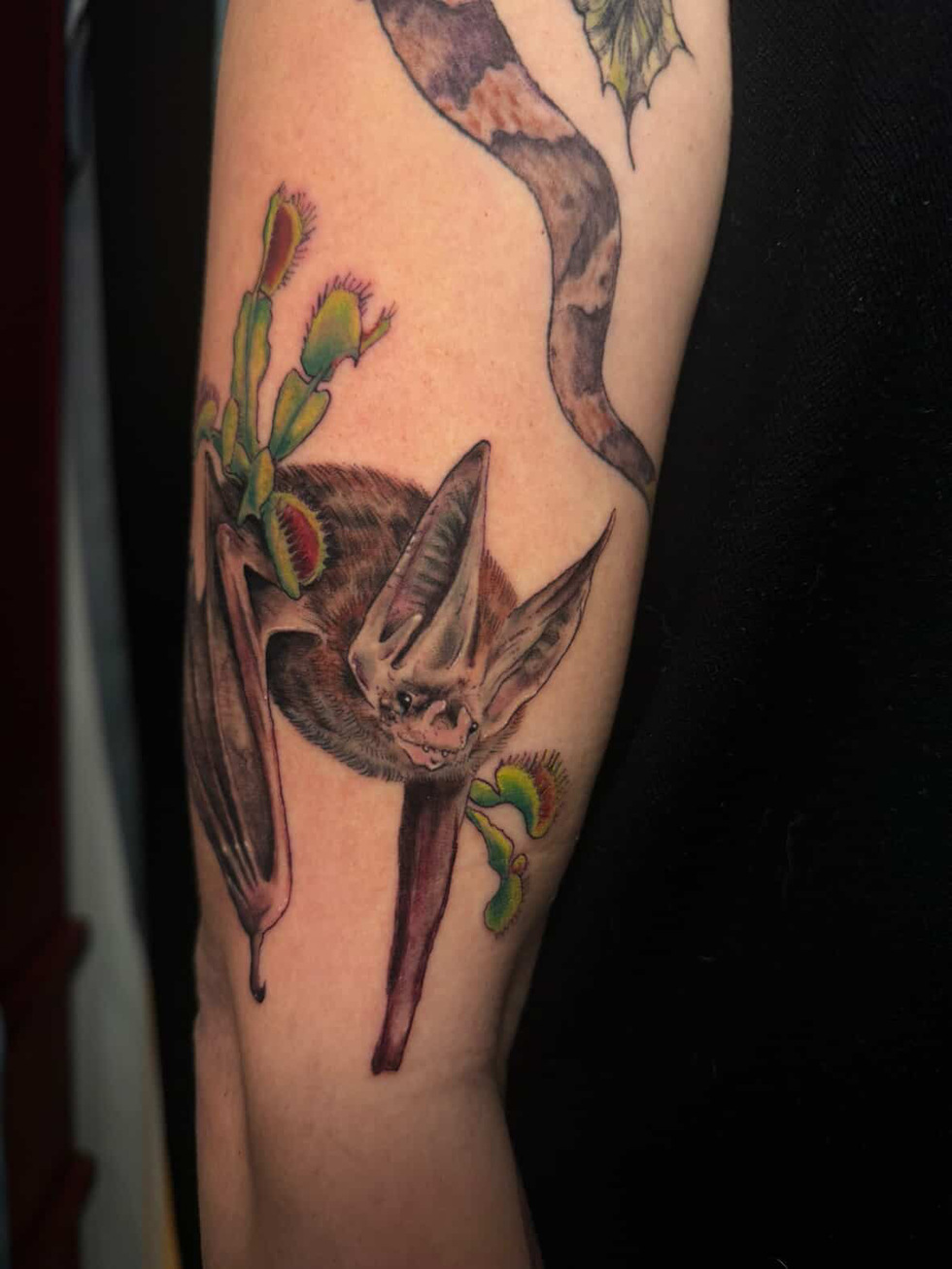The Virginia Big-Eared Bat is one of only three officially recognized state bats. They are endangered, as many bat species are and though there are conservation efforts in place, we can always bring more awareness. When my artist @zoologyink (Instagram) and I first brainstormed a sleeve to represent my home state with flora/fauna, there was no doubt we’d include a bat. Working as a cavern tour guide in college grew my love of these important and adorable babies as well as educated me on the responsibilities we have to protect them, their habitats and hibernation.