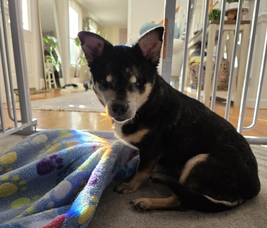 Stevie as well as 30+ others were rescued from an awful situation in Tallahassee, FL. Her eyes were so badly infected and damaged that they had to be removed. She lost her eyesight in April 2025 and was adopted by us in May. Since then, she's gone camping in Maine and road tripping in New Hampshire. Her favorite cuddle spot is in the big bed with her huge blanket.