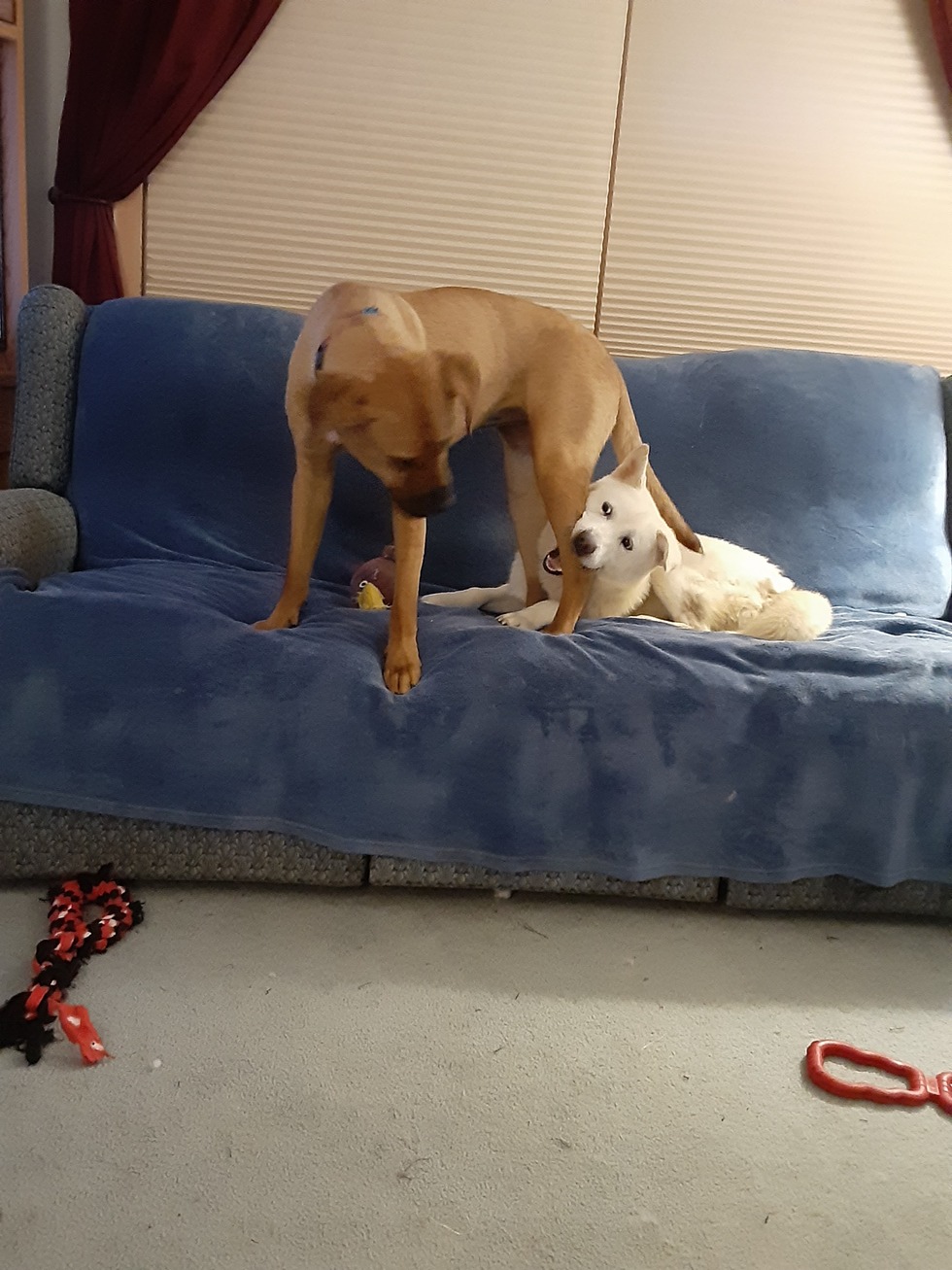 Liam is an energetic but anxious soul with countless personality traits, likely from the 16 different breeds his DNA test revealed, and the cat, reindeer, and horse that his behaviors emulate. We never know what to expect from him from one moment to the next, but he is cute as the Dickins. They are two of the best fur babies we have ever adopted and the love we give them is returned many times over.