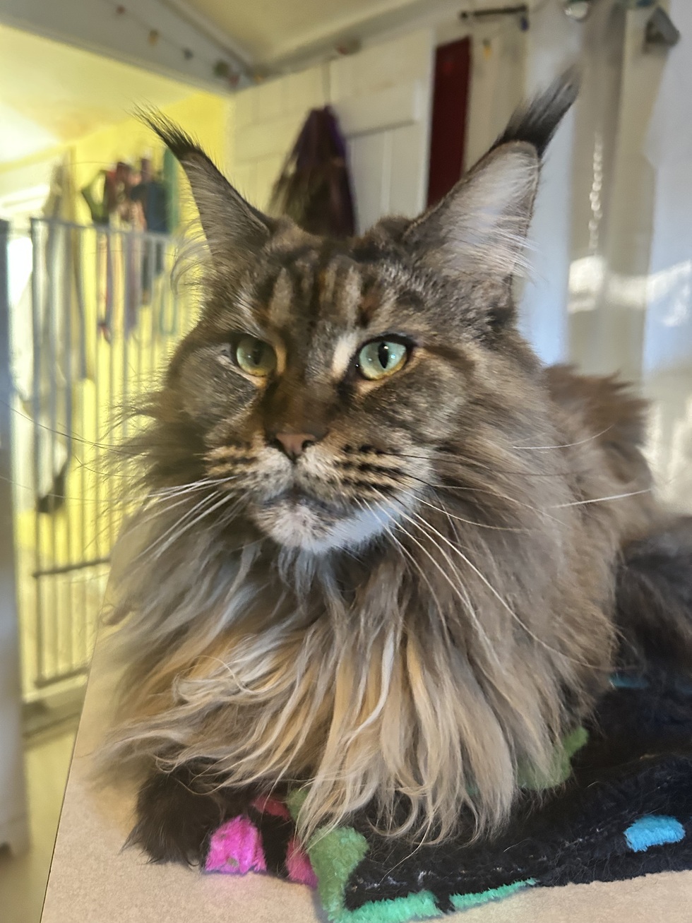 Quinn and several other Maine Coon kitties came under the care of Baypath in 2024 and they were in need of much medical, physical and emotional support. I adopted Quinn and her sister Riley and have had the pleasure of watching them grow into healthy, social, confident, playful kitties - exactly as they should be! Quinn is no doubt a soul kitty and was meant to come into my life when she did. She’s very protective of her sister and to be honey is quite the nosy little creature. She does not like to be brushed although her coat in beautiful now. Her green eyes will delve right into your soul while thinking deep, important thoughts. I adore her completely and can’t imagine life without her!