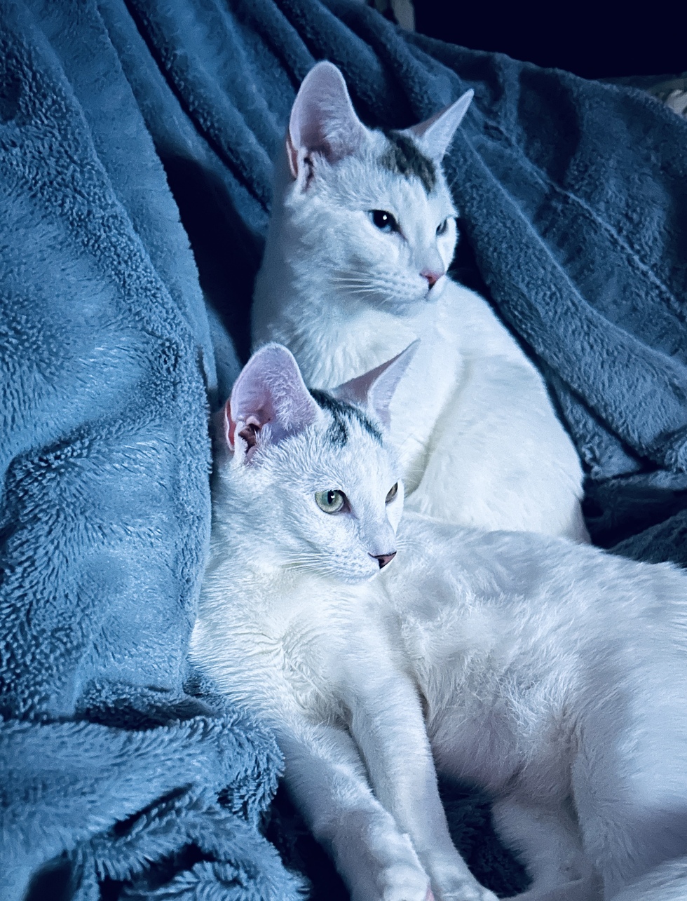 Egon and Venkman (Ghostbusters) are a bonded pair littermate cousins, their moms were sisters raising 2 litters together. Adopted at 6 months from Baypath, our kitties had disclosed medical problems. Egon and his beautiful blue eyes is living strong but is on 6 meds 2x daily and is considered in heart failure but it does not slow him down. Just celebrating his first birthday we hope he will make it to his second. Venkman’s nickname is “poonchkie” after is huge primordial sack that flaps around like a tigers when he runs. They are wonderful cats in the teenager phase that both play and snuggle. We love them and our handsome boys are living their best lives.