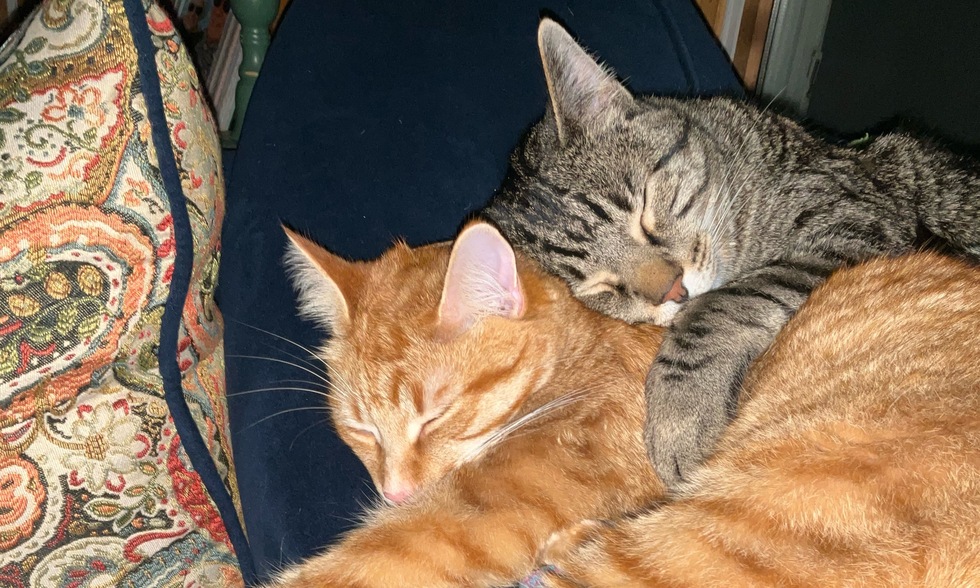 Tyson (now Remy) and Lasagna (now Ravi) were each adopted from Baypath as kittens, two years apart. When not cuddling each other or their human, Remy and Ravi enjoy perfecting their chase, wrestling and parkour skills, as well as stalking wildlife from the screen porch.