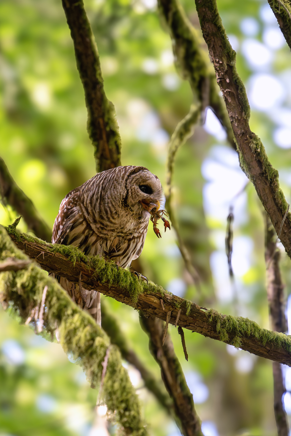 A crayfish tries to fight a barred owl but soon becomes a nice colourful snack instead.