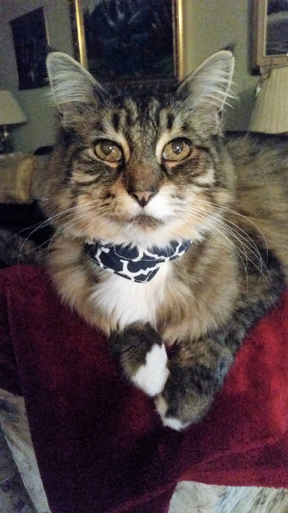 His handsome blue and white collar is new and keeps a feeding tube in place. Jack had been a very active cat so it was a shock when he suddenly curled up on the floor and wouldn't eat or drink. Three days in the emergency animal hospital revealed some heart damage, a liver problem from not eating, and an infected kidney. He surprised us all by pulling through, however he needed a feeding tube to get enough food to keep the liver healthy.