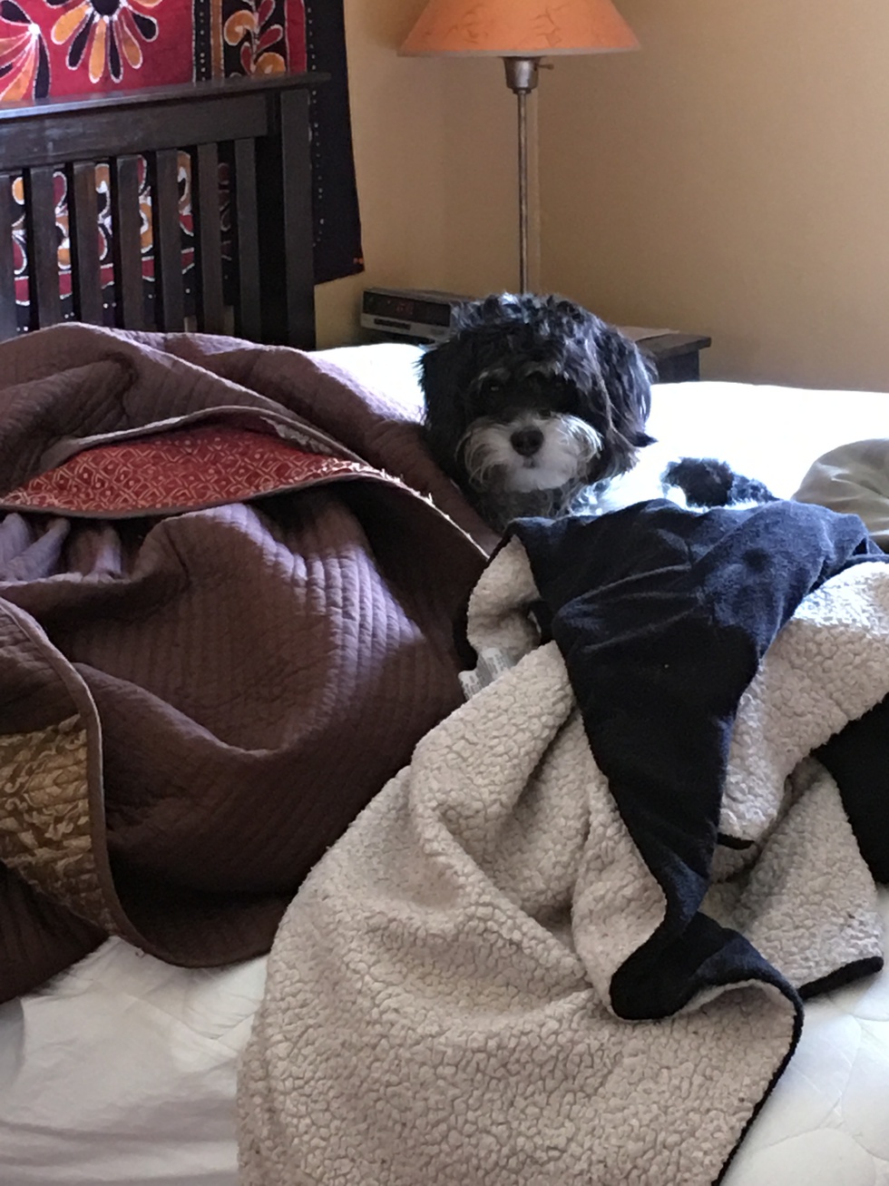 Moby is a rescue from California. He is a Mauzer, light on the Maltese, heavy on the Schnauzer, in terms of attitude.