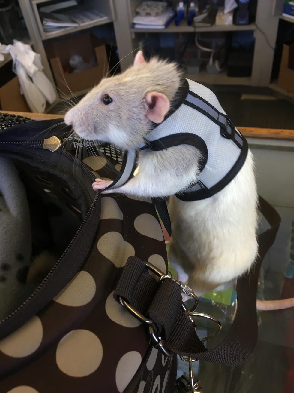 My buddy Riker loves to go out with me for walks with his other rat brothers, and to work with me.