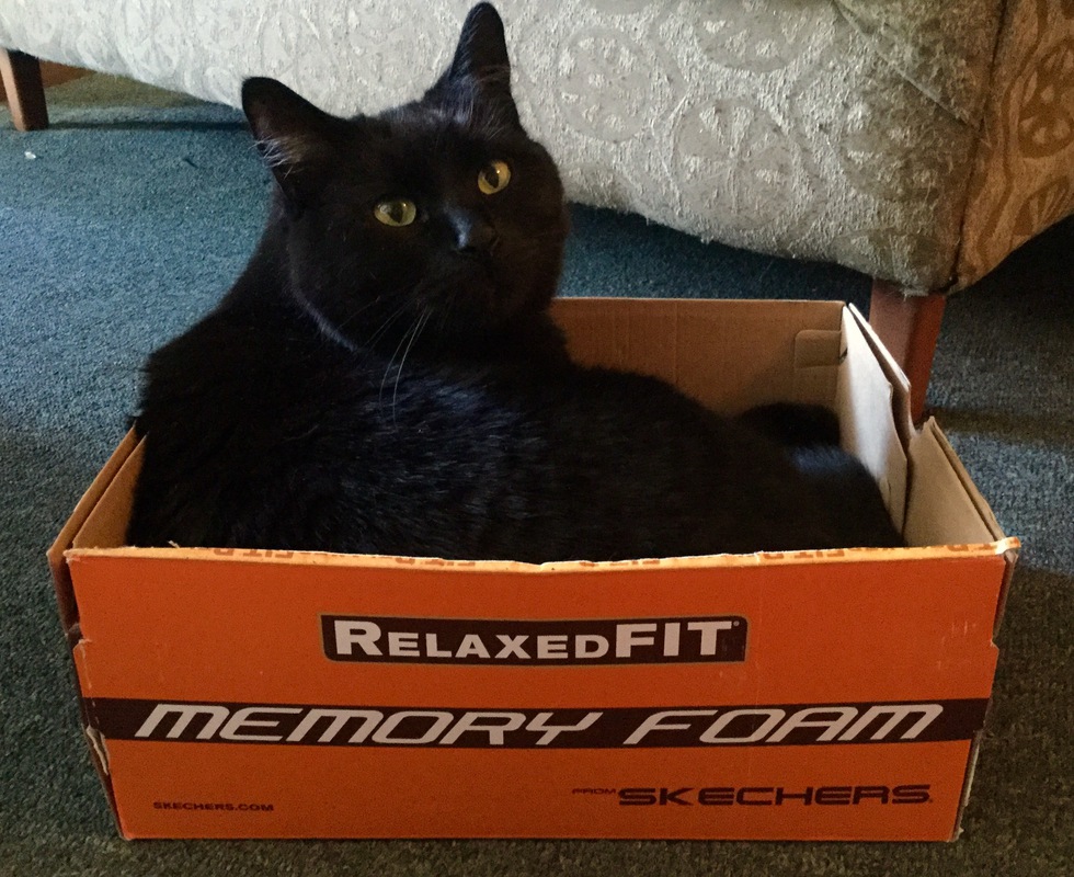 Eventually Mauly accepted him and we all became a happy family. That was over 11yrs ago now and we can't imagine life without him and his funny little ways. Like playing fetch is one of his all time favorite things to do and when he's done he loves to squeeze into the smallest box in the room and have a snooze, just like he was doing when I snapped this photo haha! He likes to find my house coat tie and drag it around the hall while meowing loudly.
