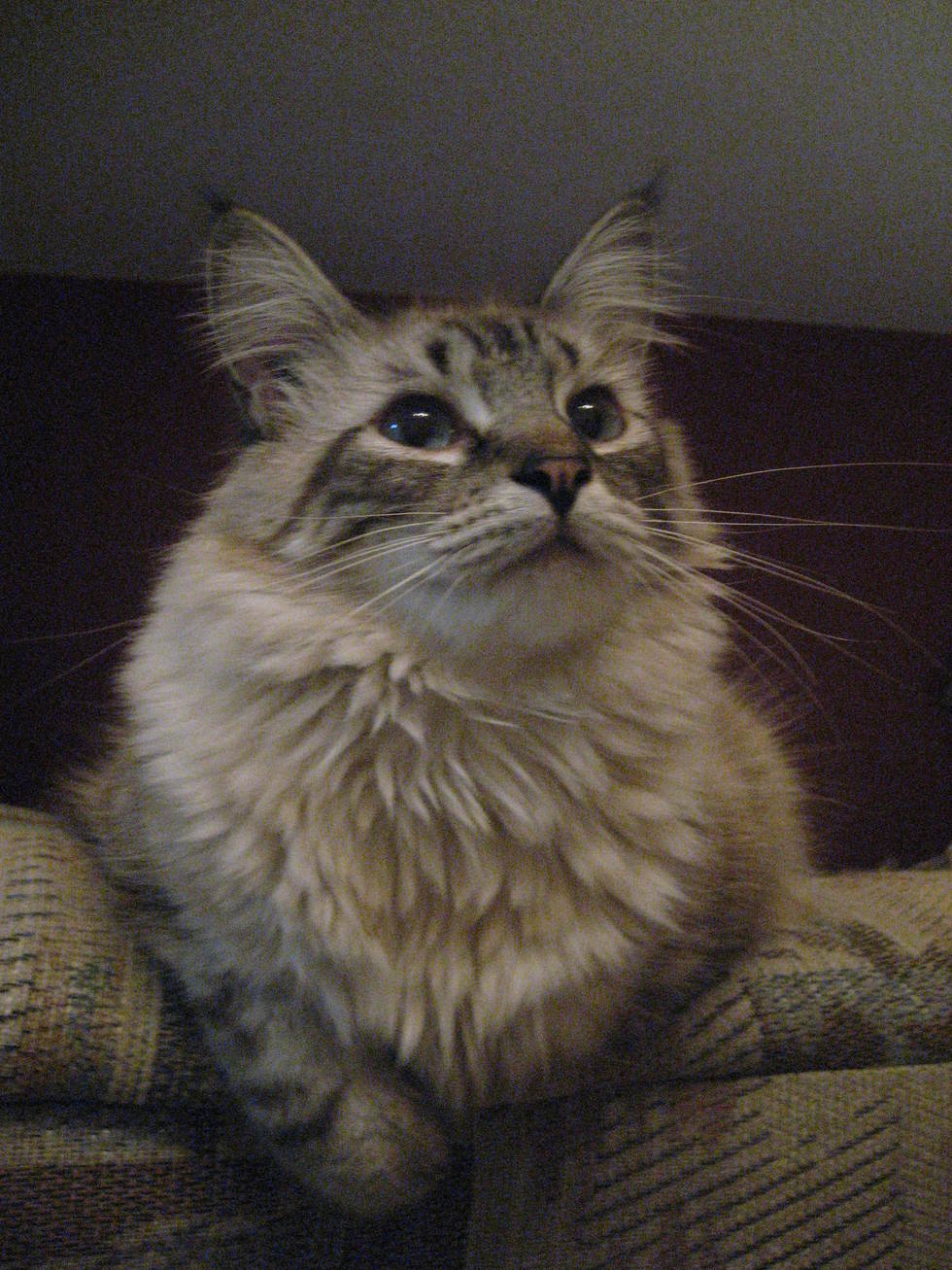 Ty also makes an excellent alarm clock, when he wants me to get up he sits on the edge of the bed and stares at me REAL LOUD till he wakes me up. If that doesn't work he will be naughty and steal kleenex and gerbil it to bits. He loves to cuddle up on my lap the instant I sit on the couch and I swear he always has a smile on his face. When he is really proud of himself by catching a toy he almost smirks. Because of his beautiful, longish hair he requires regular combing which he does not particularly enjoy, but he loves being vacuumed amazingly! They are both happy to be totally indoor cats, have regular cat-races and mock fights and watch the birds and squirrels (safely for all) through the glass.