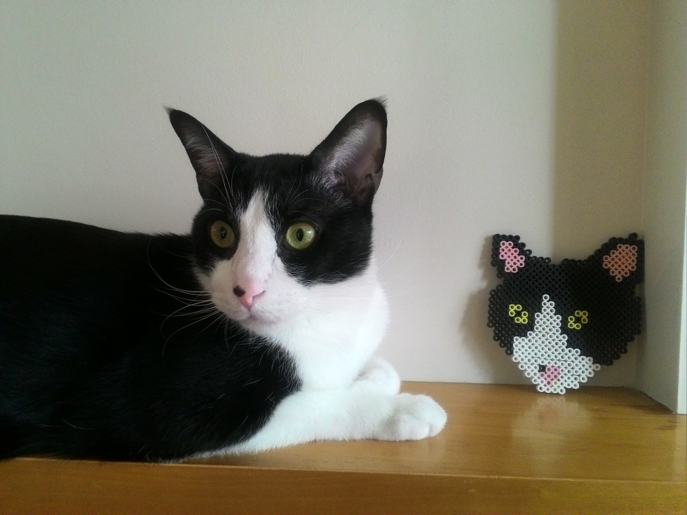 Coming from the tropics he's a bit cold here in Vancouver, but that just means more cuddling time with him. He loves to sit beside this replica of his face on top of the fireplace. Occasionally when we shut the lights of he freaks out and attacks his face art during bouts of feline hyperactivity.