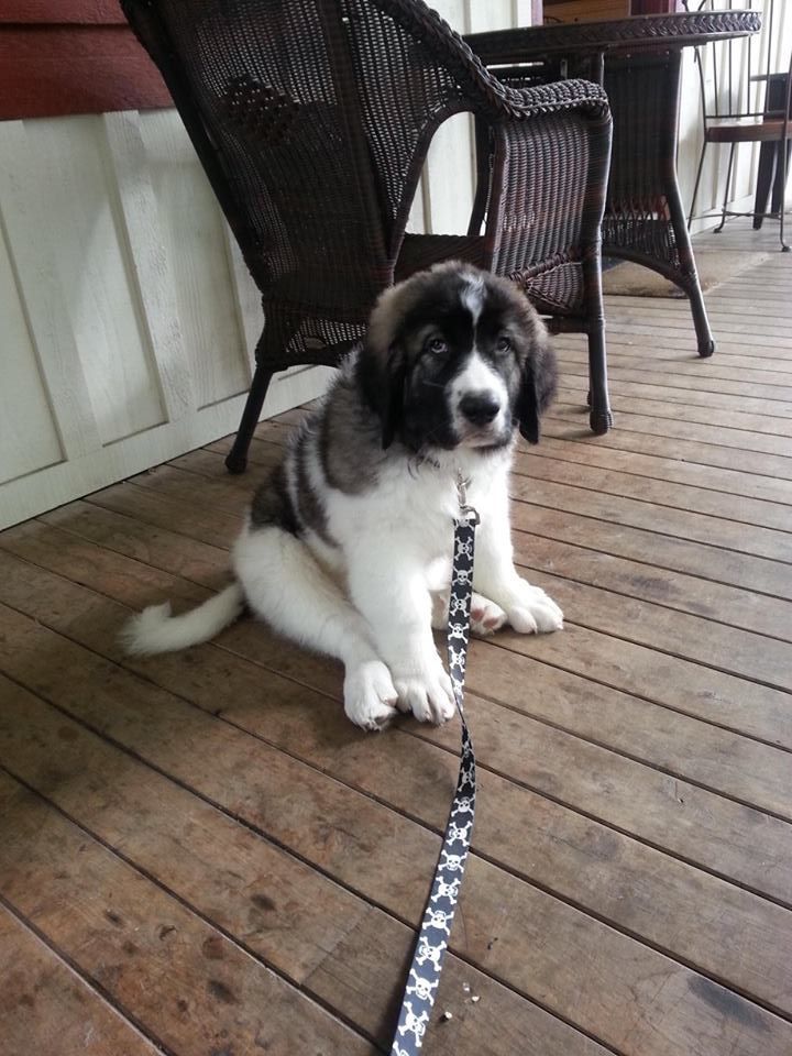 Doc's first outing at 12 weeks of age, he was 35 lbs. Huge paws and a huge heart. He is now 150 lbs of Pyrenean Mastiff love! He is a cherished family member.