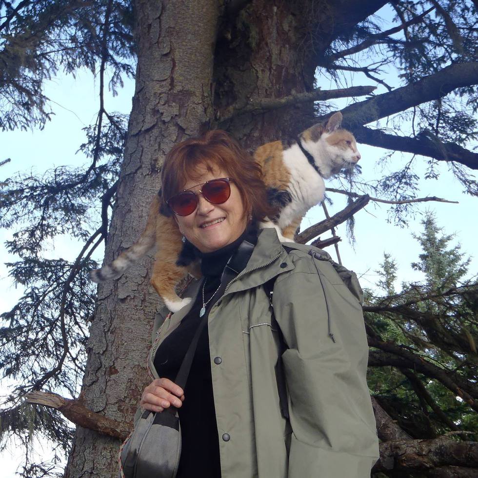 BioPookie is a Calico Cat who was born the runt of the litter. She was a feisty kitten who stood her ground with her brother, Beni, a Russian Blue. She loved to play string and to run around the house with her brother. Sadly, both Pookie and Beni contracted liver cancer and died. Pookie is seen in this picture on my shoulder in the Sooke, B.C. area by the wild Pacific Ocean. This would be the last trip she would make before her death. She is well remembered and loved.
