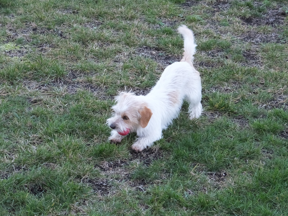 This photo was taken on the first day that she learned about "balls". She had never seen one before, and was clearly confused about the game. After watching a couple of other dogs chase and catch a ball, she tried it herself, and immediately went "bum over head", having stopped her front legs but not her rear ones. She was totally delighted and proud of herself for her accomplishment !!