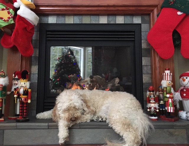 BioGoldie is our six year old Goldendoodle. She is a very sweet and loyal companion, so eager to please and be petted! Her most favourite passtime is to bask in the heat from the living room fireplace. This is where we found her Christmas morning, amongst the stockings and nutcrackers, sleeping on the hearth, waiting for us to join her by the Christmas tree.