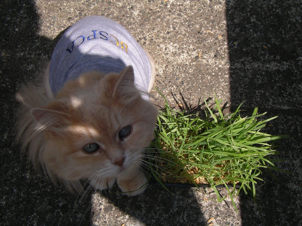 Mini Wheat made her appearance in the 2006 Paws for a Cause walk on Dallas Road, the only cat there; snug in her carrier and pushed in a stroller amongst a sea of different sized and shaped dogs!