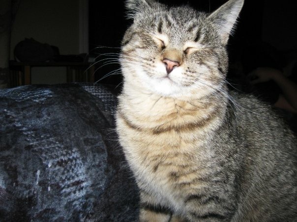 BioMarlee was raised with our old dog and has always believed she is more dog than cat. Quite often her Tabbyness makes her appear to be smiling in pictures, this was the first one when she was a year old! She is now 2 months away from her 8th Birthday and we love her more every day.