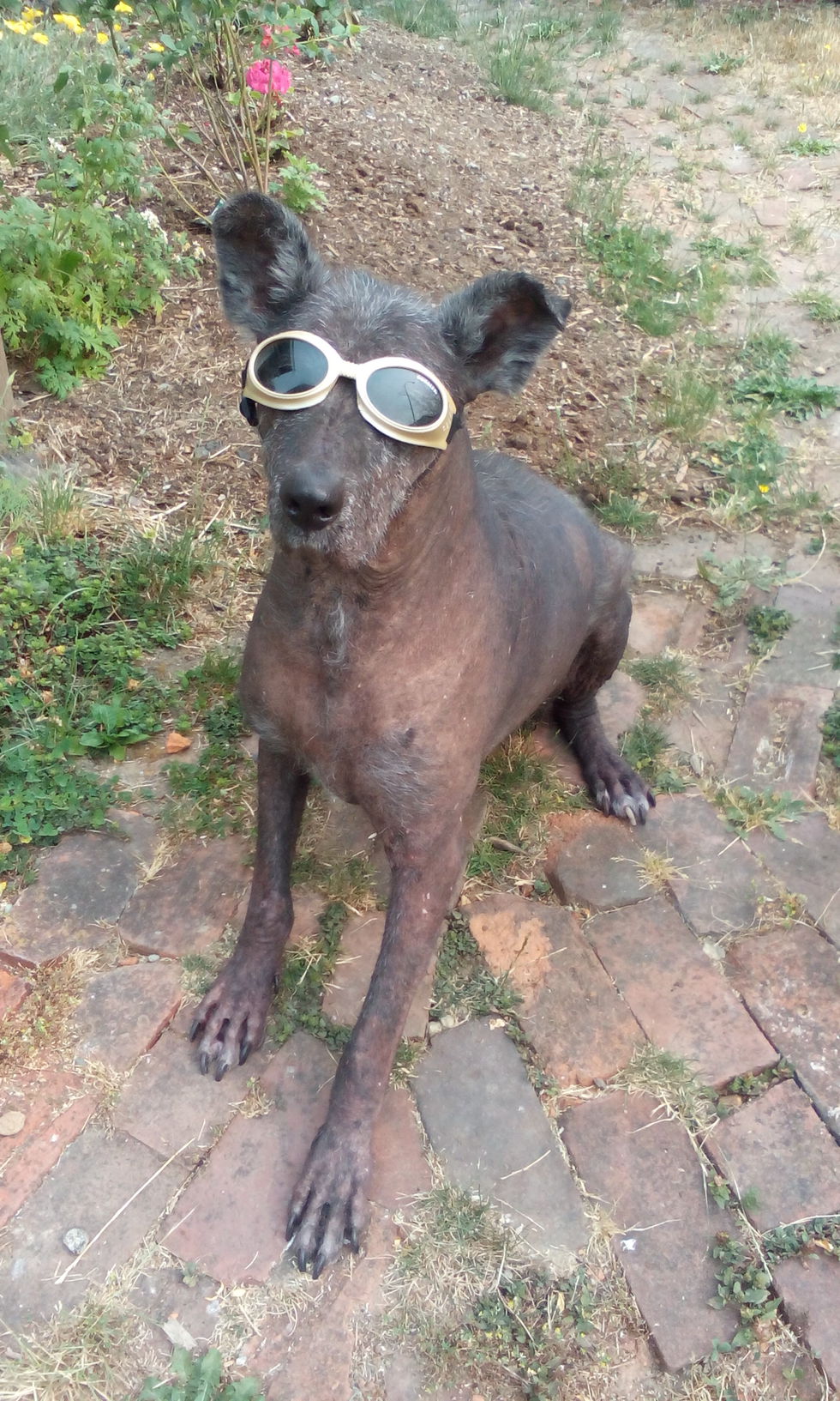 Animal BioTommy is my rescued (Standard-size) Peruvian Hairless dog... at the time, I believe he was the only one in Canada! It took a year to find out his breed. He is wearing Doggles as he when the sun was bright, it would blind him.