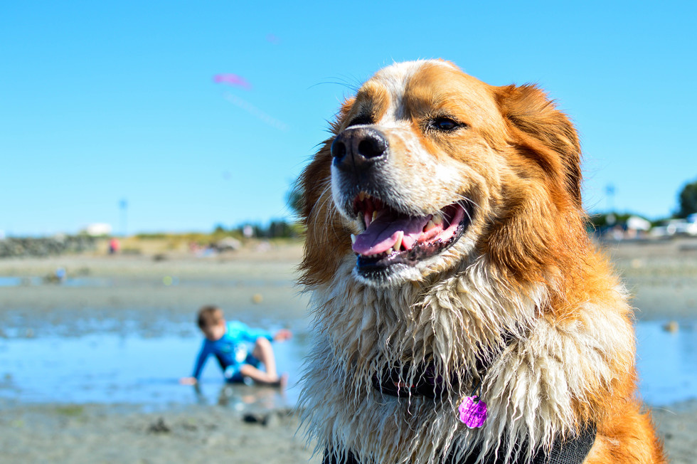 In this photo, Cleo is enjoying a beach day. She loves to swim!