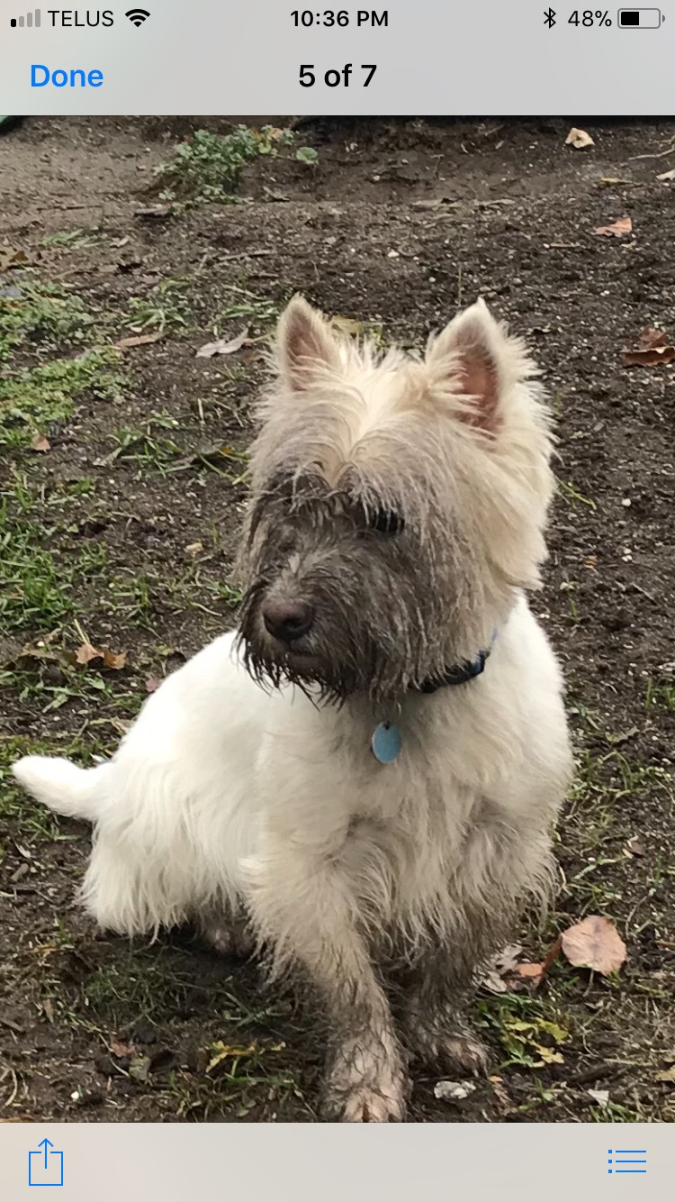 Animal BioWe adopted Max last summer from a Westie Rescue Group. He came to us as a very shy nervous fearful introverted dog . He had spent his first 5 years contained to small spaces and a crate. He had had no regular exercise ( no walks or plays) or was allowed outside for any physical activity. He was so out of shape when we first got him. He had a hard time going up and down stairs. He did not know how to play with toys and was terrified of squeaky toys. Chasing a ball was a puzzle to him. He is a terrier, for goodness sake! His life has changed dramatically with us. He is walked daily, he has a big backyard to run around and supervise! He has Westie friends and loves playing ball now. He has gone camping and is learning how to make friends with other dogs and people. When I took this picture he was in the trail of some rodent from a pile of leaves in our yard last fall. The critter was long gone but he was in full terrier mode running around sniffing and following the trail ! He was having so much fun and looked so happy we both had to laugh! Dirt washes off ! It was so nice to see him being a regular dog and having fun. Now he is a very physically active strong little dog. He is enjoying affection more and as the months pass and he is much happier and settled . We love him to bits!