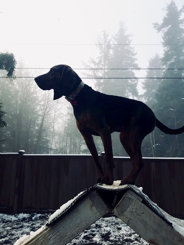 Animal Bio2.5 yr old female Plott Hound. Lives to run and bark 😂 We picked this breed specifically as a trail partner for running, mountain bike riding and warning for bear and cougar. She is fearless, has endless amounts of energy and drive. She loves learning tricks and recenty started agility. She is a wonderful trail partner and a very protective pet. If kept tired she is happy to snuggle all night by the fire.