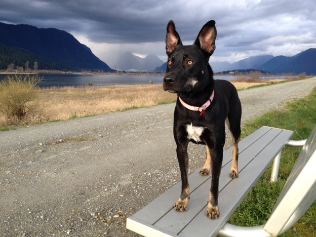 Animal BioRoxy was 11 months old and in the Quesnel shelter. She had been placed there from her first owners. Due to her insatiable energy, they could not deal with her and turned her over. The Owners had adopted her from the same shelter when she was a pup. They had actually found her and her litter mates off a country road in Quesnel with no homes around. They took them to the shelter and eventually adopted her later. I came across her on the shelters website. I was entranced by her eyes. I live in the lower mainland and made arrangements to go see her. It was a 8 hour trip one way in February 2016. I fell in love with her and adopted her on the spot. We have since found out that she is more than likely a Australian Kelpie herding dog. Hence the insatiable energy. That suits us fine as we love to cycle and hike. We have brought her to a herding class with sheep and she has the instincts. She just wants to be anywhere we are hiking,cycling or lounging on the couch.
