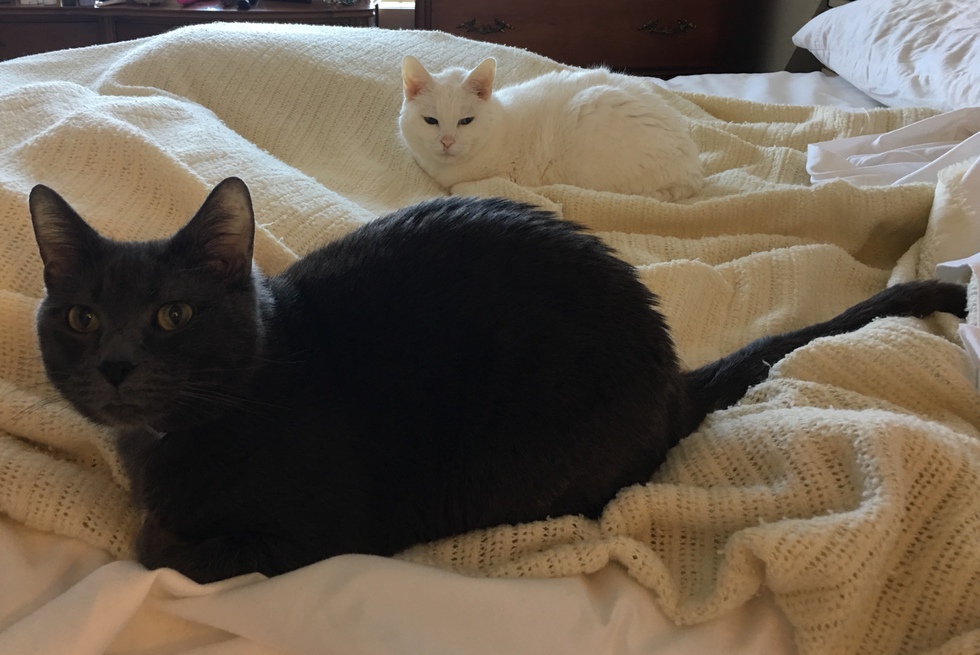 Animal BioWe adopted Delilah (grey, 2yo) from the Burnaby SPCA in February 2018 to join Morwen (white, 13yo) who was adopted in Ontario 12 years ago. Delilah has quickly become part of our family and has shown that she is a gentle, affectionate and patient cat (even with kids!) just like her new feline friend.