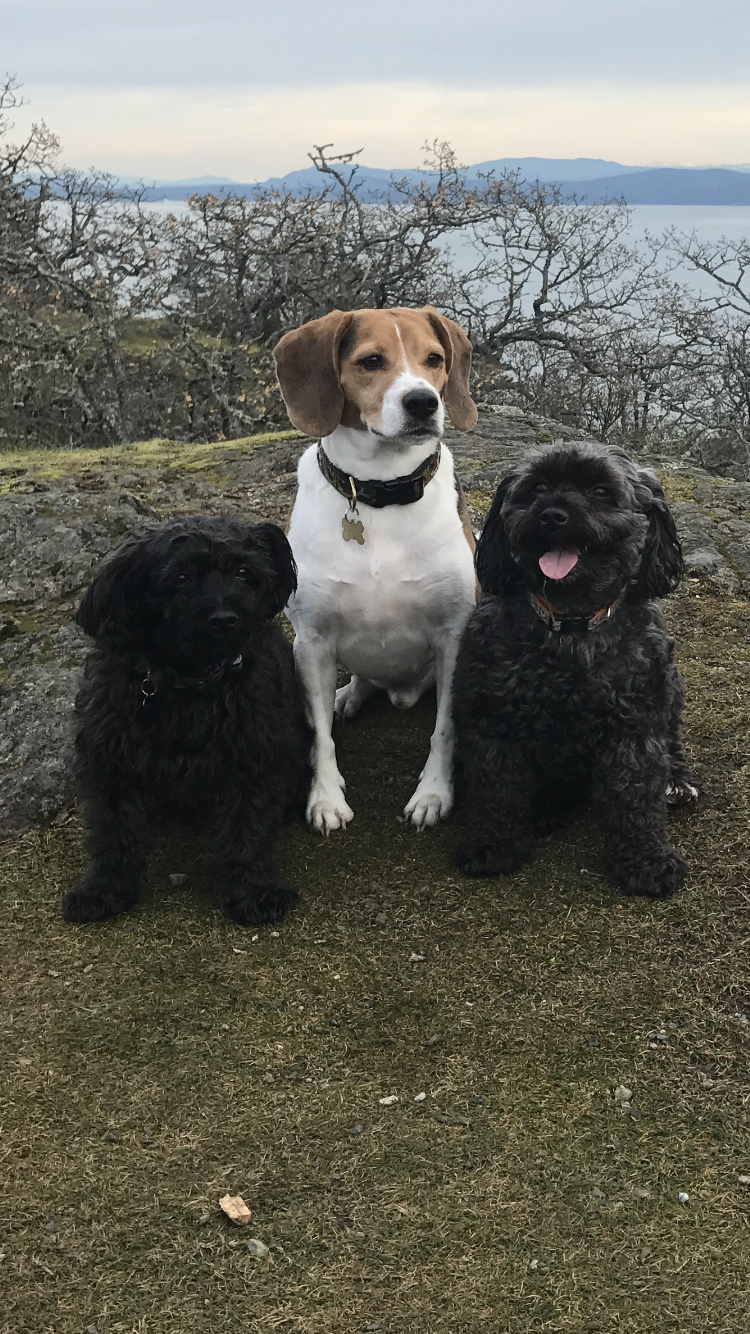 Boots purple and Rudy are a blended family, out for a hike on mount Doug in Victoria. They are great friends!! Rudy is 9 and boots and purple are 8