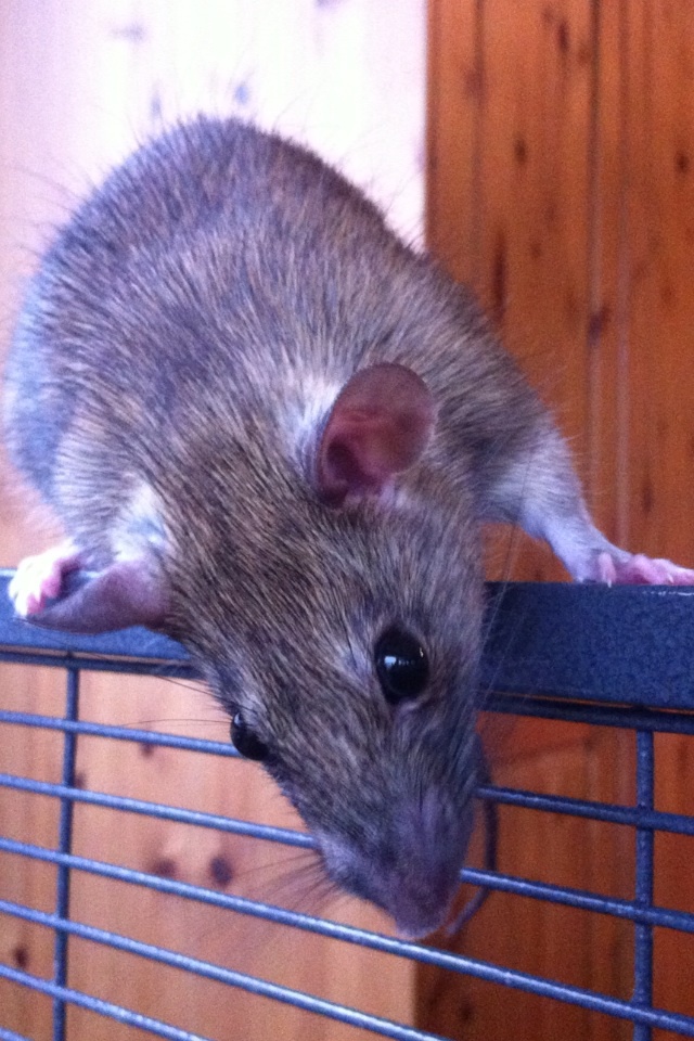 Animal BioClover was found in the clover of our lawn in late Fall 2016. We don't know what happened to his mum. His eyes and ears hadn't opened yet so he was very young. I fed him with kitten formula every few hours for weeks with a syringe until he could eat baby rat food. He is a delight and so playful and clever. He doesn't hesitate to give our cats and dogs heck when they come too close to his cage either!