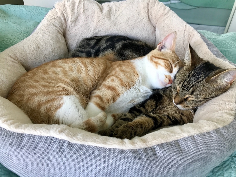 Animal BioWhen we first brought Cookie home, she was a scared little baby that would find the darkest most difficult to reach spots to hide in. We were worried she would forever be scared and not let anyone near her let alone another cat that was twice her size. To our awe and amazement, as soon as she met Zoe (who we adopted from you in 2016) she blossomed into a completely different kitten. She is now very very playful, purrs and grooms Zoe whenever she is around her and is an all around very happy kitty. She is still a little skittish with us, but loves Zoe to pieces.