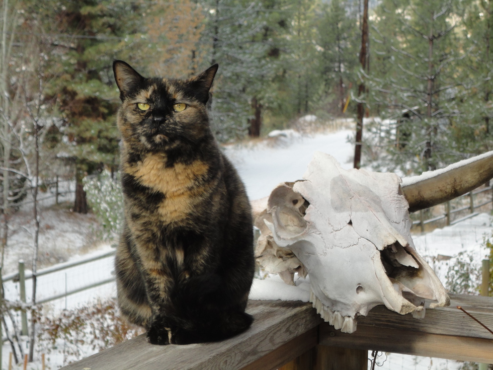 Animal BioEmma, arrived at the SPCA from the streets of Penticton with 6 kittens in tow. Sadly 4 of them died and Emma was very ill. We adopted her 5 months later at 11 months of age. We had to introduce her to 3 large dogs at home but they accepted her at once. At first, she was desperate to go outside but we waited until Spring to put in a cat door. We live out of town. She is a very tiny cat but can run fast and quickly climb up trees. She is now 13 - quite a survivor!